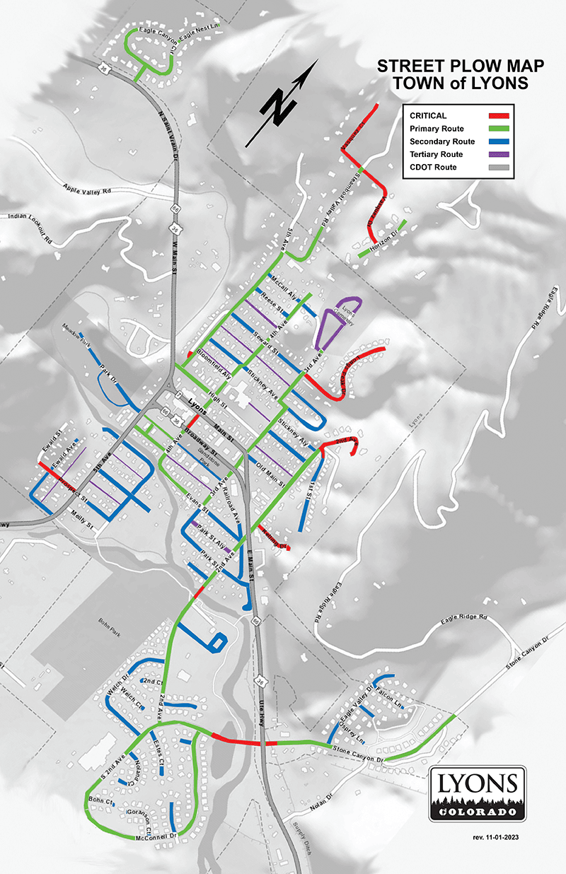 The Town of Lyons maintains approximately 9 miles of roadway. The Town is NOT responsible for State Highway 66, US-36 or State Highway 7 through Town. The remainder of the roadways within Town limits are prioritized based on category: Critical (red), Primary (green), Secondary (blue), Tertiary (purple).